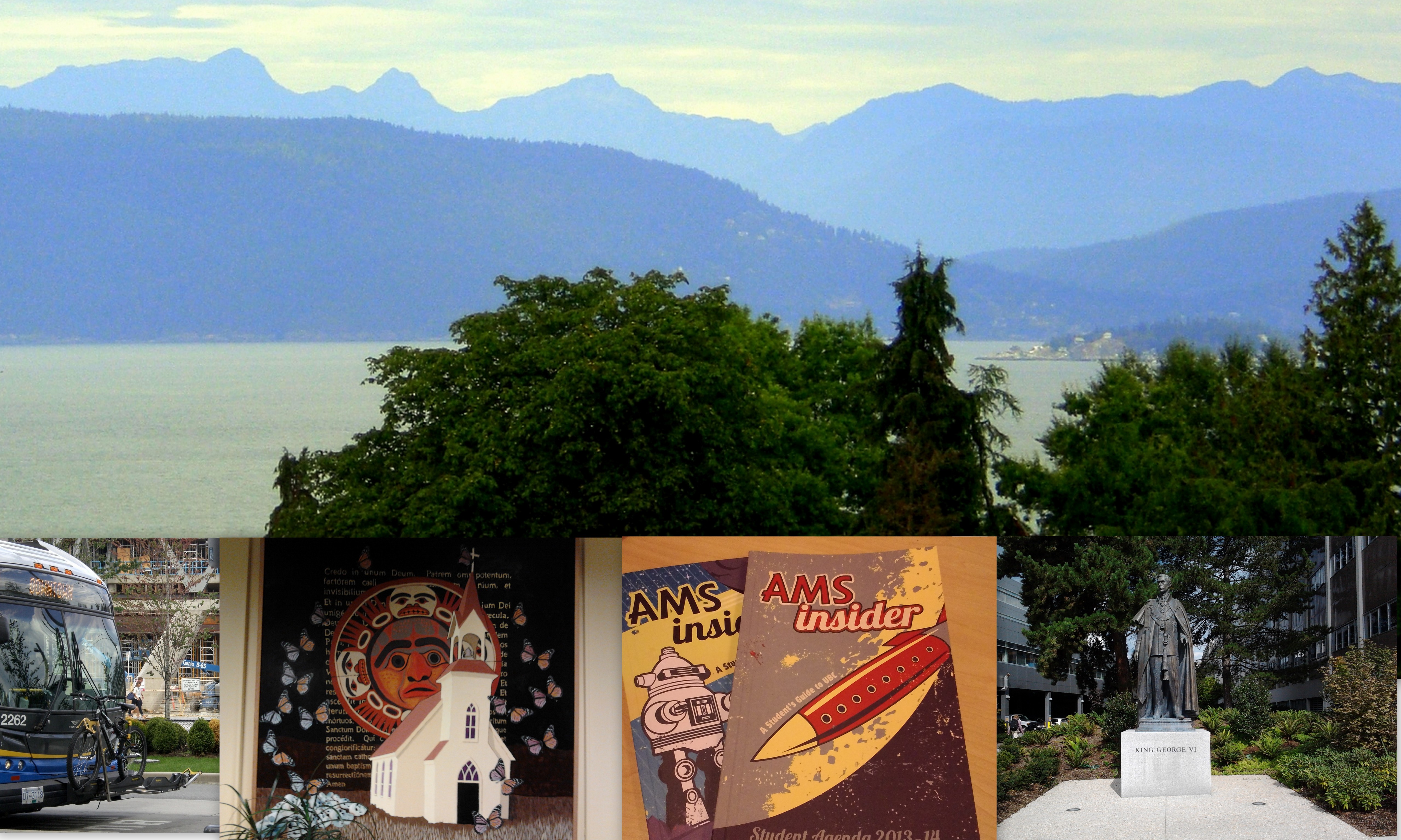 From top-left clockwise: Ponderosa Annex E (or PONE, where some of my classes are held), a re-purposed cathedral and tower, the Chan Centre (concert hall), a rose garden and the Koerner Library.
