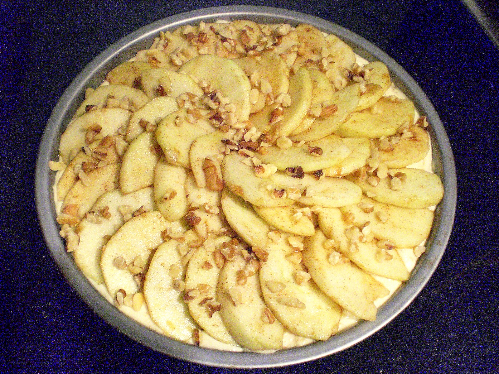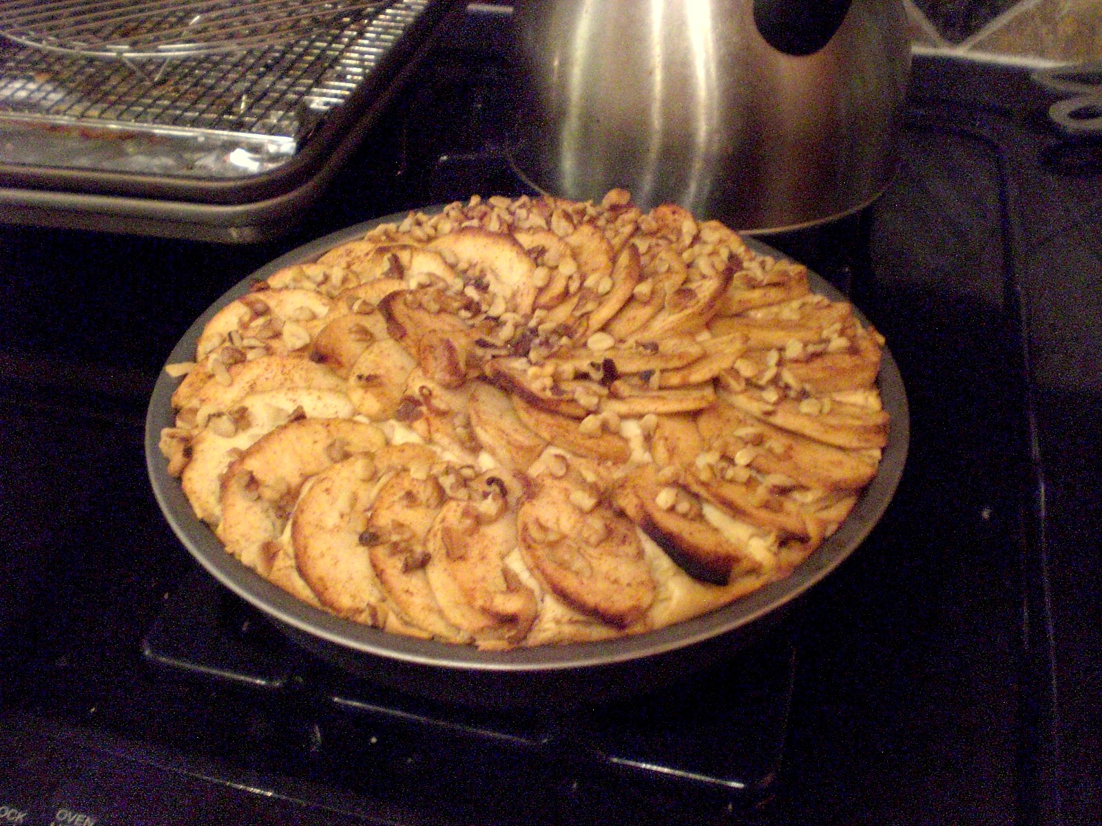 Bake the crust at 350 C for 10 minutes, then take out and assemble in this order: cream cheese, then apples. Easy instructions, yeah? Feel free to get fancy with the apple slices. I always like to make sure I have an extra apple just in case there are more ugly slices than pretty slices and I need more slices to complete my pattern. That’s assuming, of course, that I can make more pretty slices out of the extra apple. Once you’re done arranging, sprinkle with walnut crumbs and slide the whole kaboodle back into the oven.