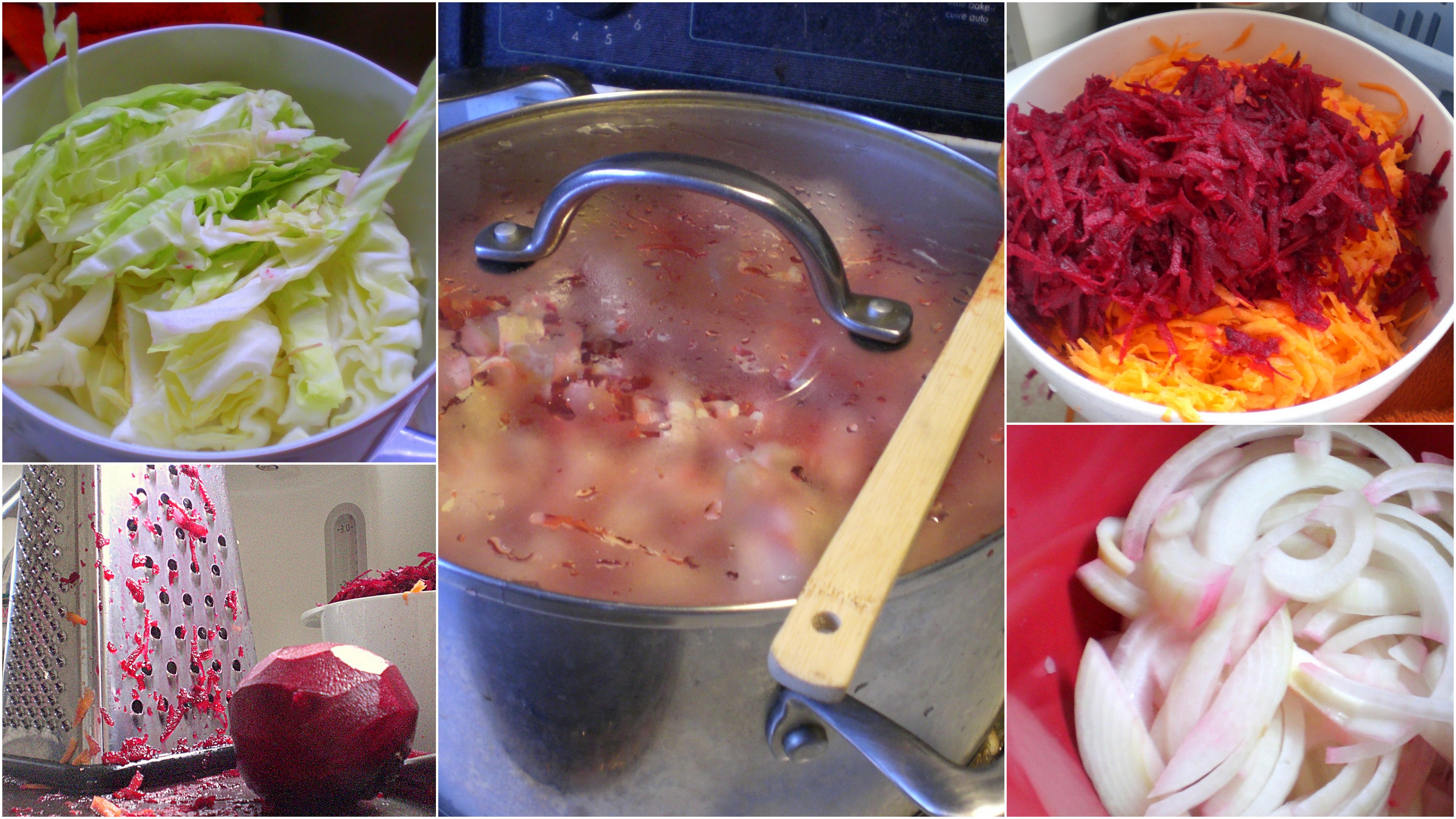 Originally we had cut up three potatoes and put them into one bowl for the pierogy stuffing, and cut up another potato in another bowl for the borscht. What had happened though was that Pink and I had happily grated all the rest of the borscht ingredients into the three-potato bowl, and then dumped everything in without realizing our mistake.