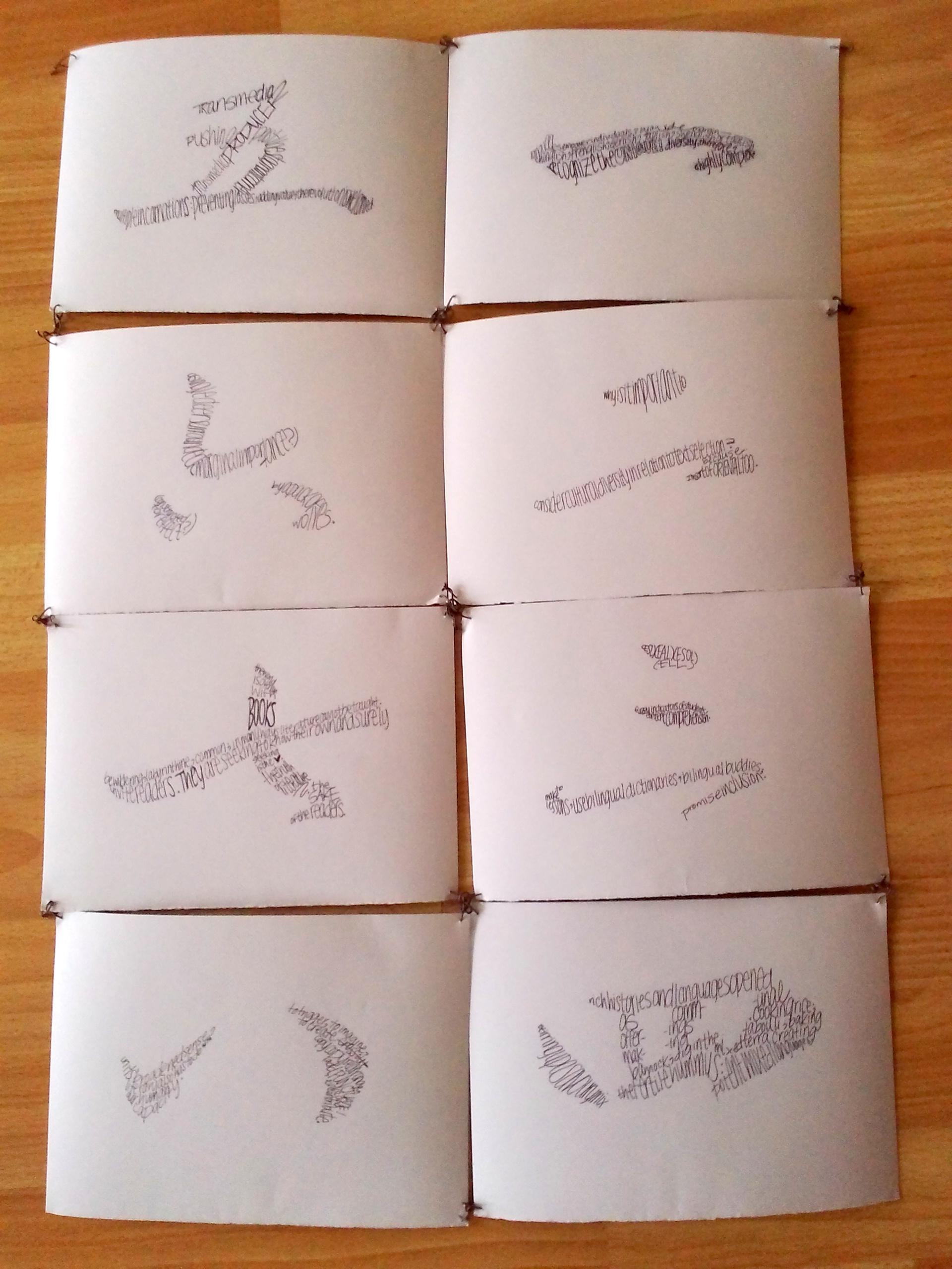 The rest quickly followed, and I guess they became concrete-found poems because I ended up writing them in the form of some very familiar characters: