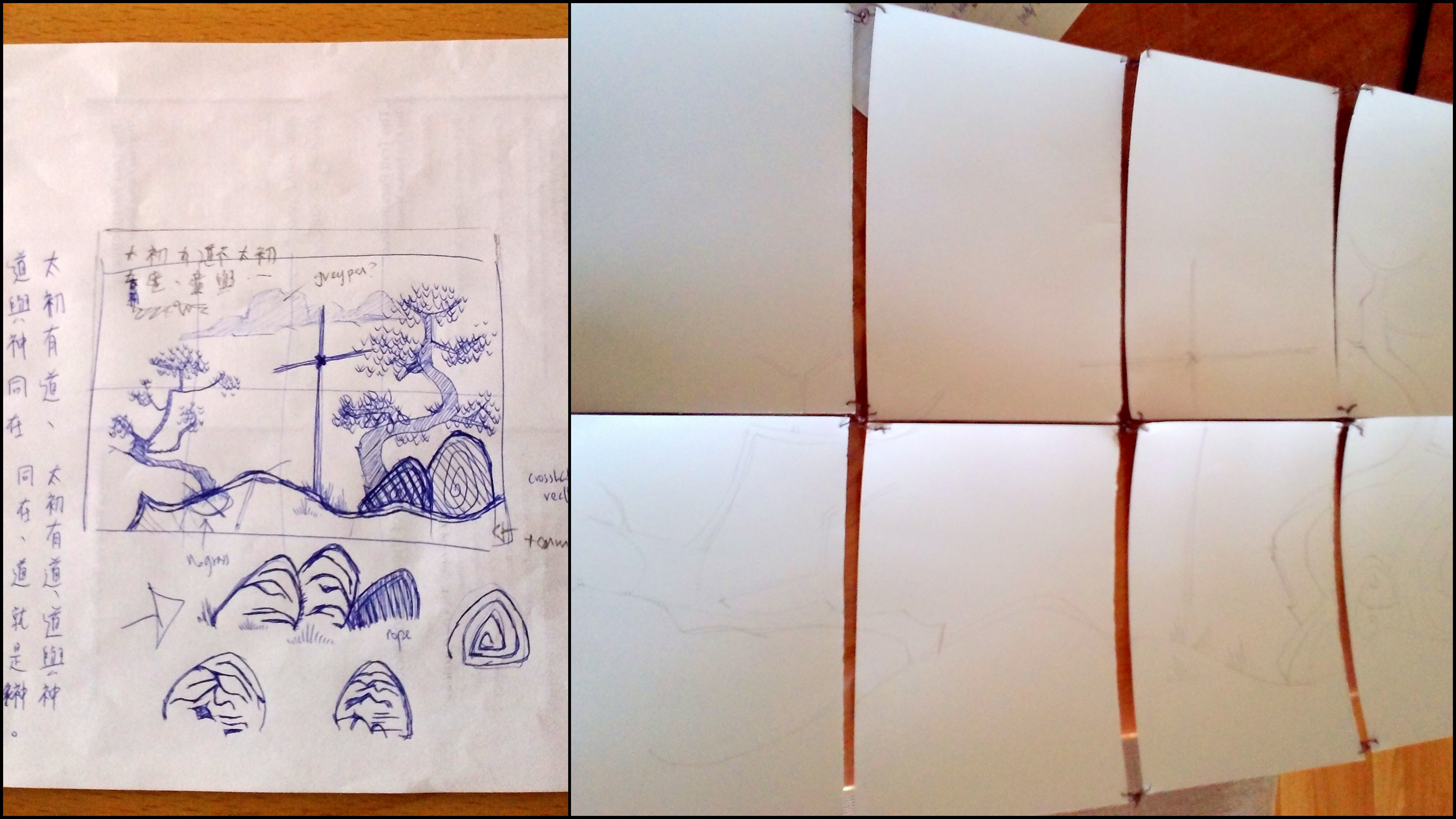 This is the sketch I started with, which then transferred over to the back of the eight pieces. The pencil sketch is pretty hard to see though. The eight pieces were already separated so that actually made drawing / colouring a lot easier since if the very worst happened to one piece I could scrap it and make another piece without wrecking the entire thing. I did aim for a Chinese-style painting (I was thinking old men by waterfalls at first) but then decided to keep it simple. Lots of Googling of “chinese trees” occurred here because I needed models.