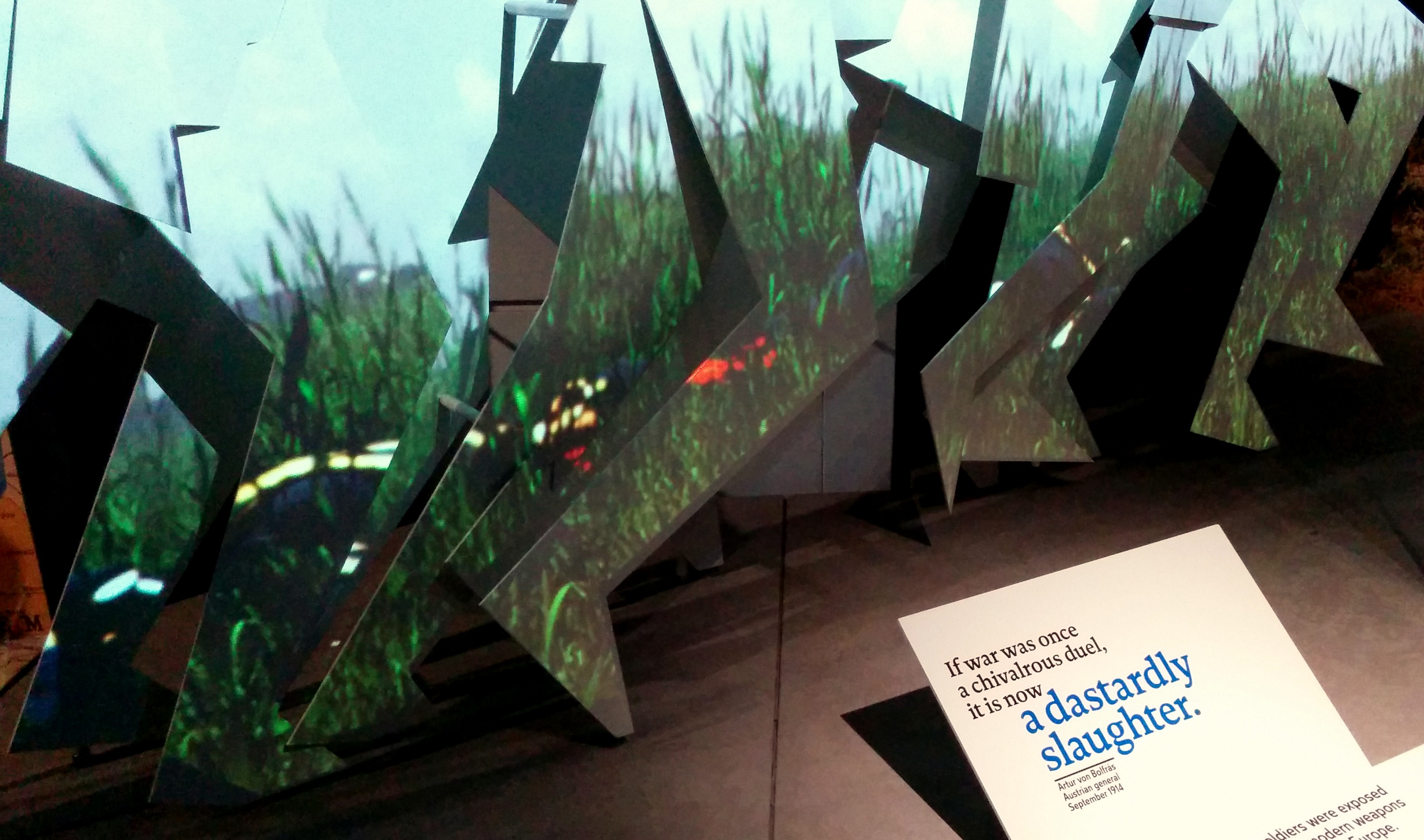 Because we were visiting on a weekend, the museum had to delegate different groups of people to different time slots for their World War One exhibit. Although it was crowded and there was a bit of wait to even enter, the displays were well worth the time spent. The picture below is of an exhibit I found particularly moving. Images of marching soldiers were projected onto life-size cutouts of men moving forward. As you stood observing, however, there came the whistling of bombs overhead, the frantic yells of men and the panicked heartbeats that grew to be the only sound, echoing, as the projected men fell into the green grass and at the feet of the cardboard men.