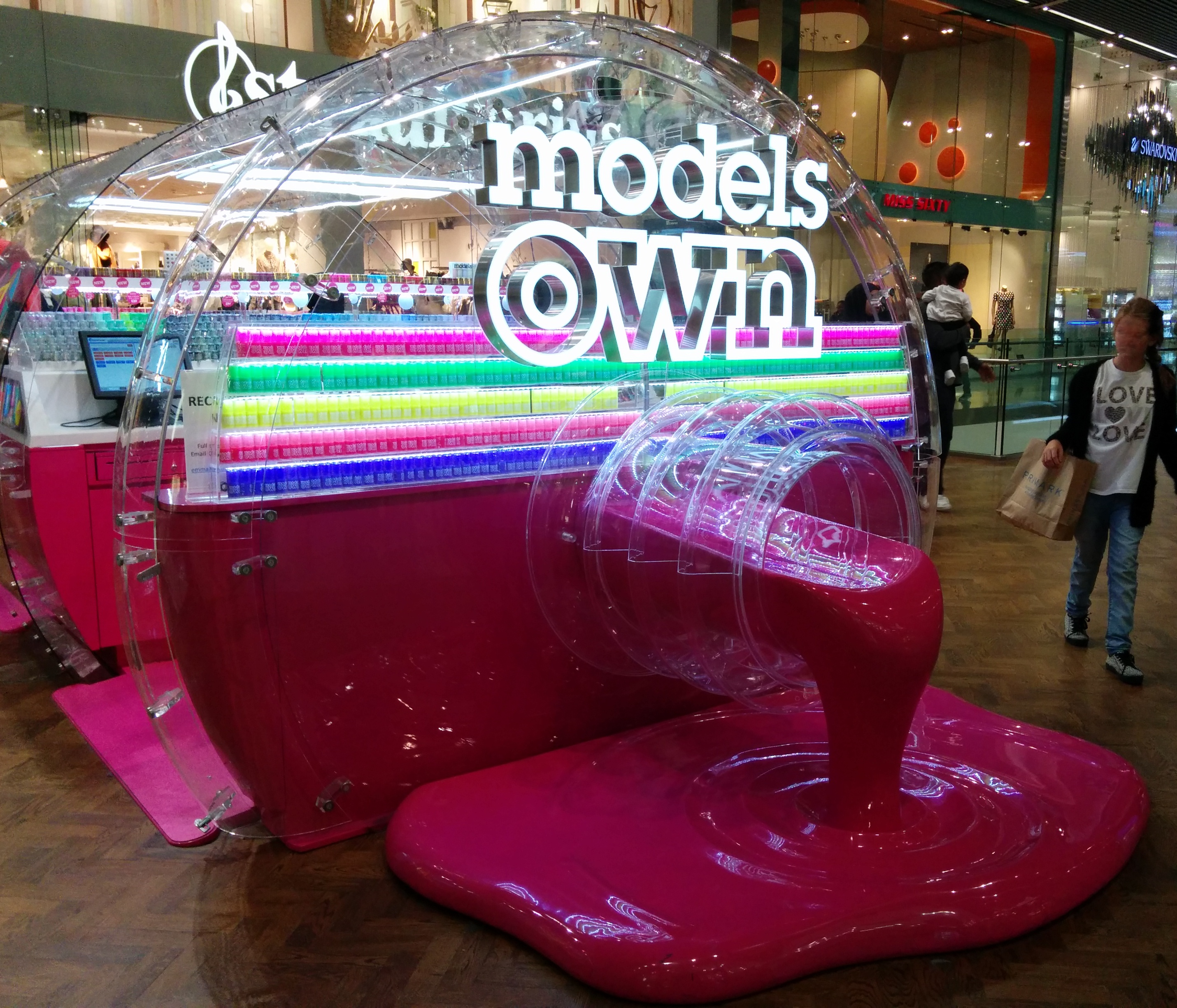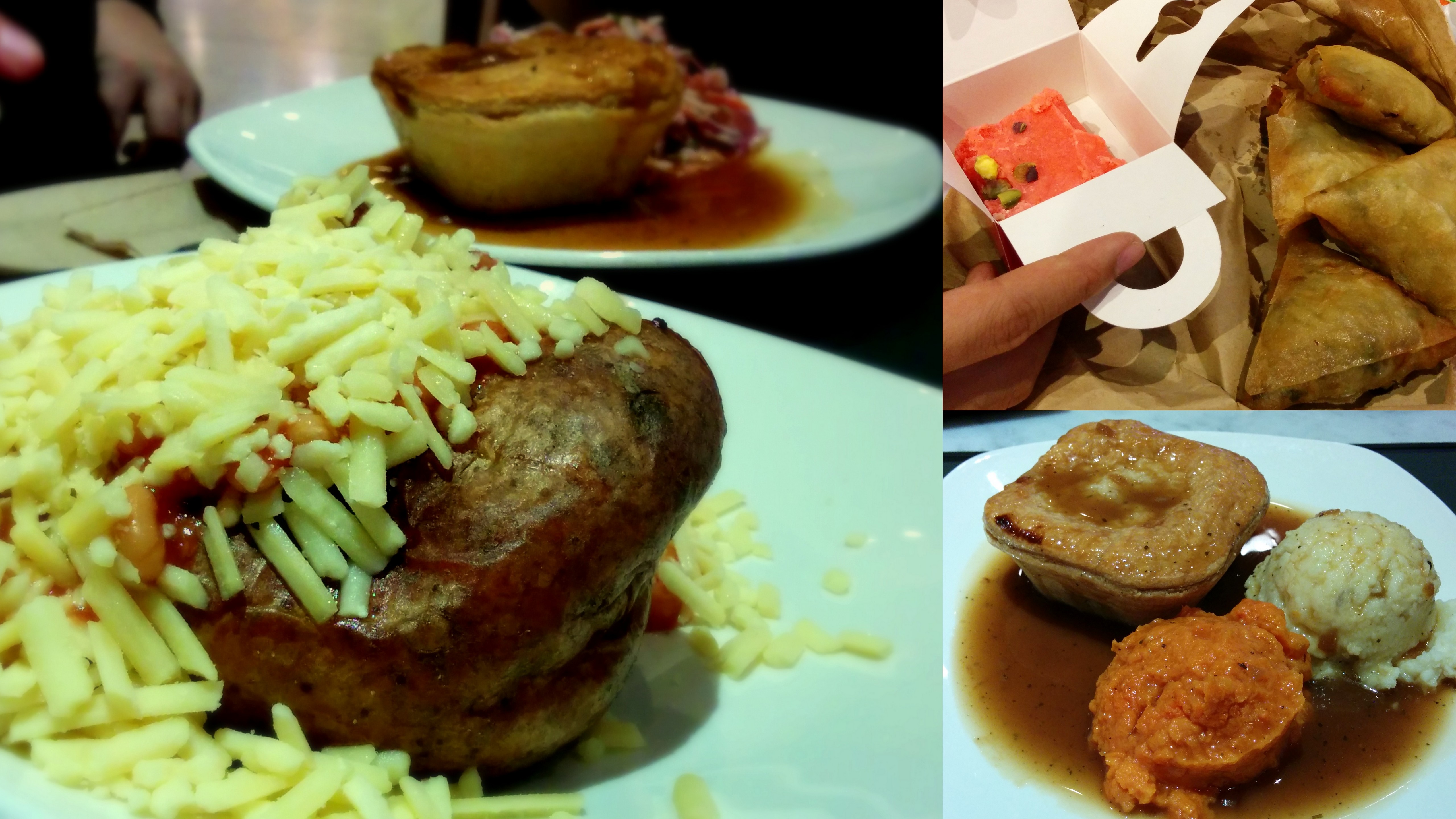 Mall food in London is great too, especially if you’re at Westfield. Below are pictures of bread for sale, our snacks (barfi and samosas), baked goods that sorely tempted me (especially those fruit tarts!) and our dinners: pie and mash and a jacket potato. The displays at the mall are also quite creative, like the massive bottle of nail polish selling (what else?) nail polish.