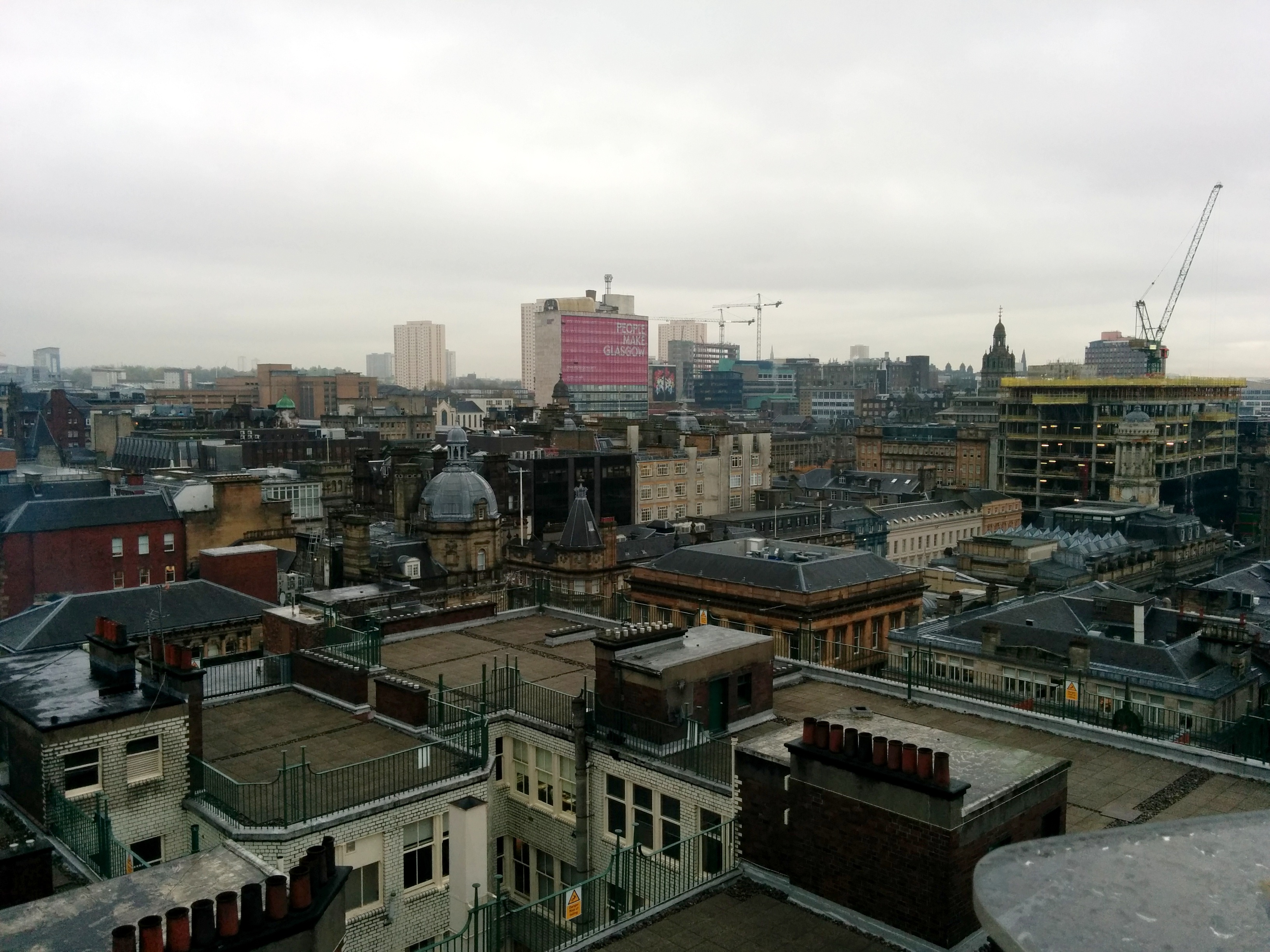 After such a delicious meal, we set out to find The Lighthouse, home to Scotland’s Centre for Design and Architecture. There were several exhibits concerning community projects in and around Glasgow but what Jack and I really enjoyed was the Mackintosh Centre, a permanent exhibit of Charles Mackintosh’s work. We had visited the Mackintosh House on the previous day but at both locations we hadn’t been allowed to take photos. The only photos we have are those from off the top of the roof of the Lighthouse, which can be accessed via dizzying flights of stairs.