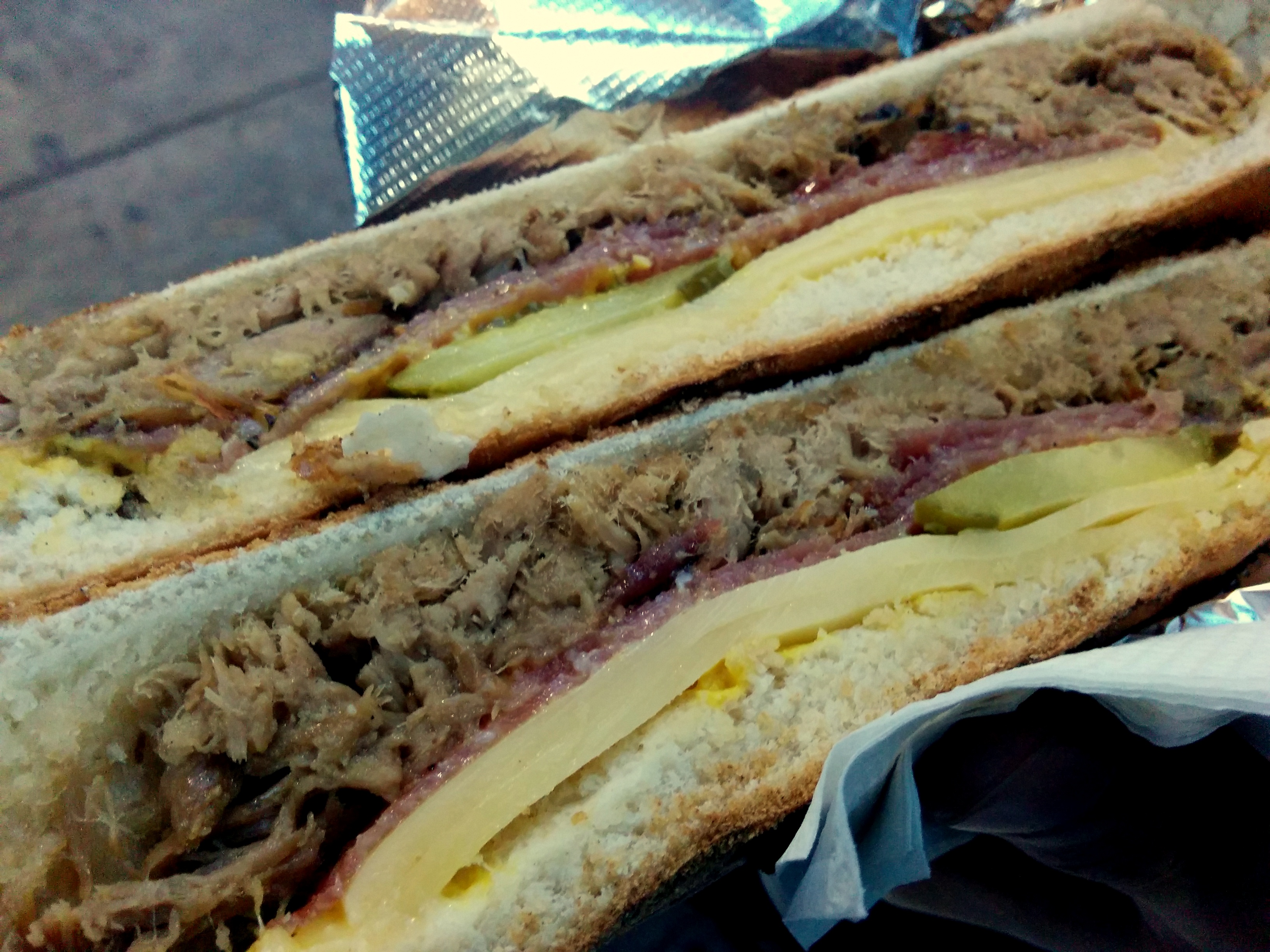 Next was a four-cheese panzerotti (£4), a savoury filled Italian pastry, and then a Cuban sandwich (£5). The panzerotti was okay, being reheated only briefly in a chilly marketplace. The Cuban sandwich, however, was amazing. Slow roasted pulled pork, salami, mustard, pickle and Swiss cheese pressed in Cuban crusty bread made for a mouth-watering, crunch-jamming sandwich that Jack polished off in no time.