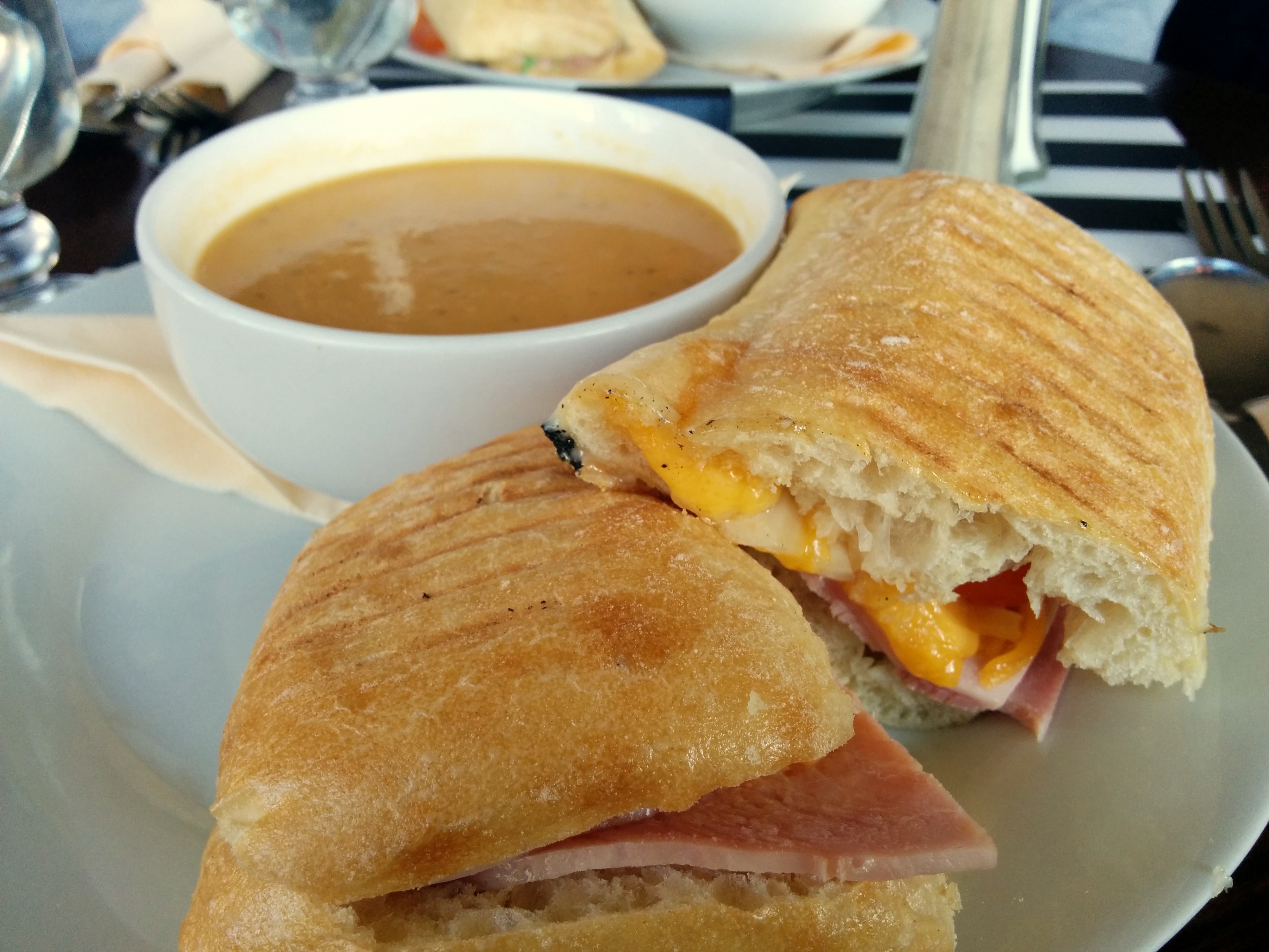 The soup, which was a rich and creamy vegetable soup (tomato-based, I believe), was savoury and warmed us right to our toes. The panini we ordered were both piping hot: crisp on the outside and cheesy on the inside. Jack opted for the parma ham, brie, rocket and tomato sandwich, while I went for caramelized onions over rocket.