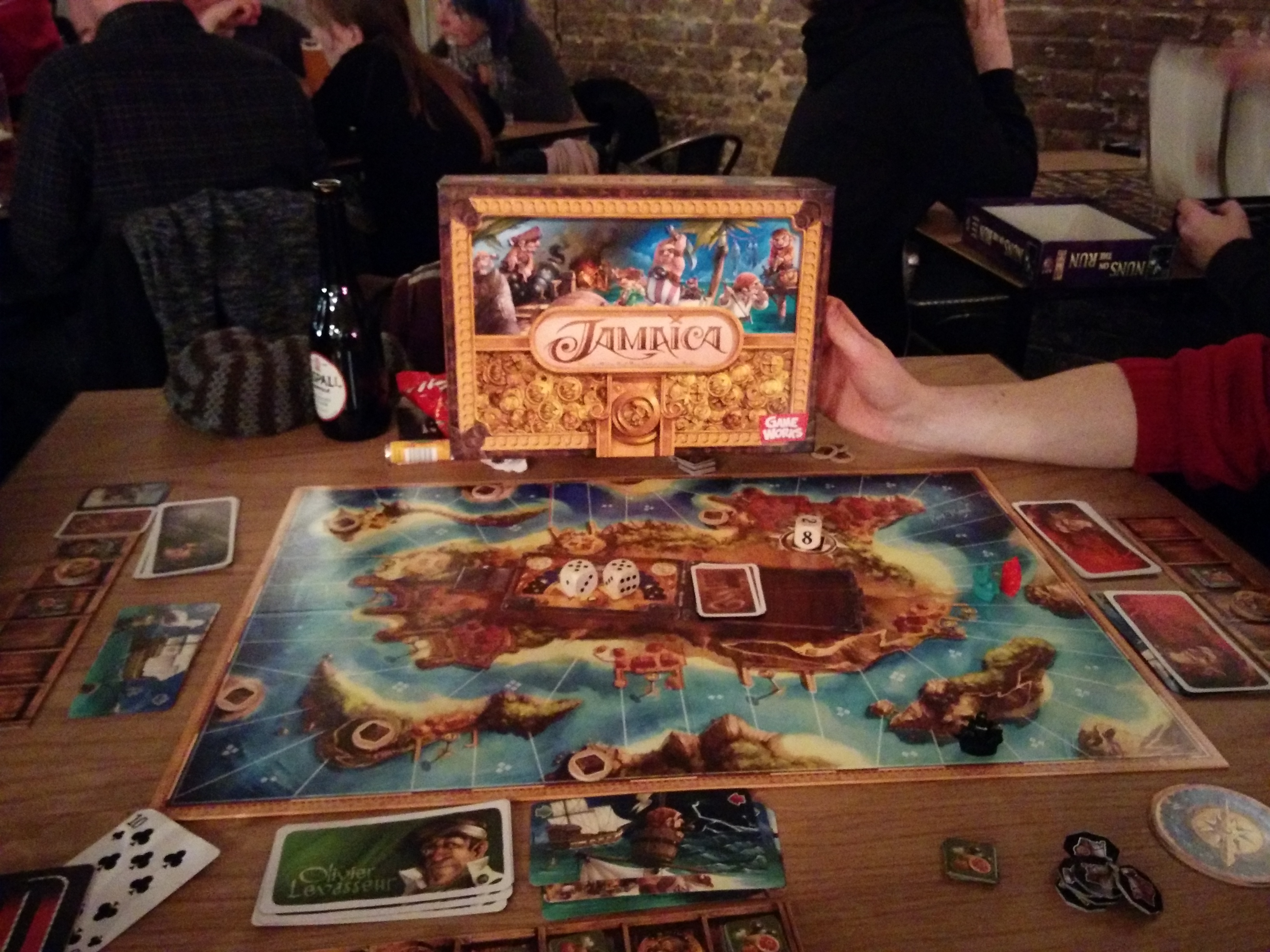 Jamaica is a light racing game of pirates racing around an island where you’re trying to grab the most loot as well as winning the race. The one with the most loot at the end of the game wins! The game is much lauded by Tom Vasel and co. and the DiceTower, so this was something that I really wanted to check out. There’s a neat mechanic here where dice determine the strength of your actions, but the main player gets to determine the order of the dice while you only get to determine the order of the actions. While the game was neat, we found it to be a little too light.