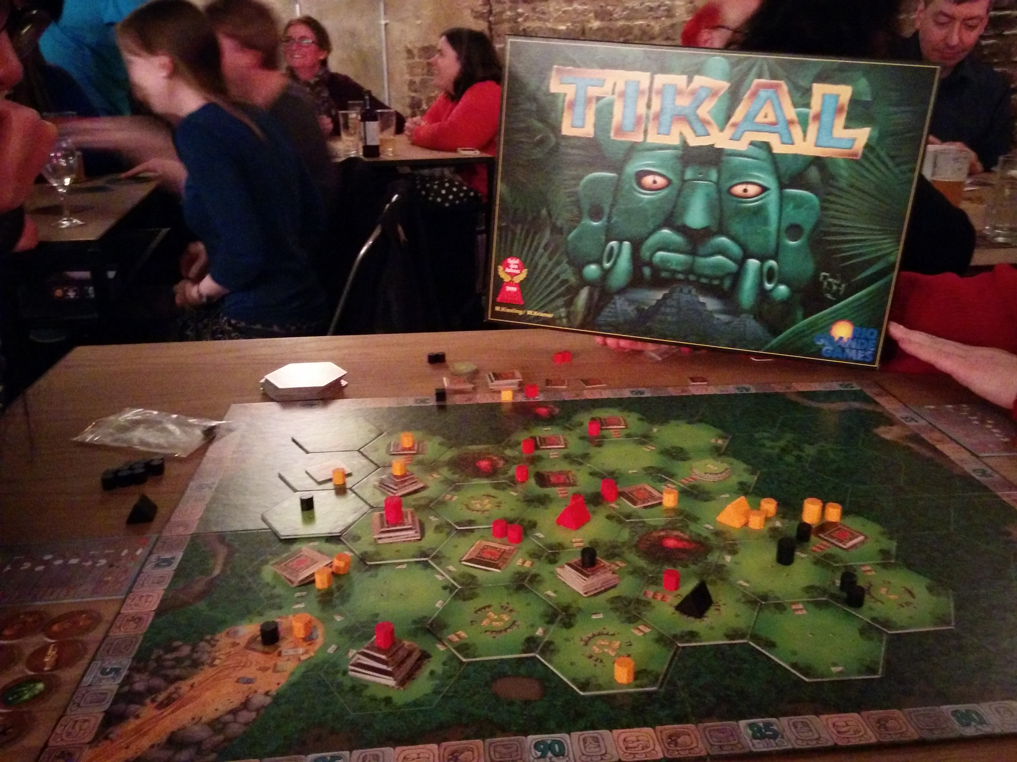 Tikal is an older game where each player leads a group of explorers in Central American jungles looking for temples and searching for treasure. The game gives each player a set of action points per turn (different actions cost different amount of points) to explore the jungle, excavate temples, set up camp, and dig for treasure. This was a favourite of Andrew’s that he already owns, but he was super-stoked to teach us the game.