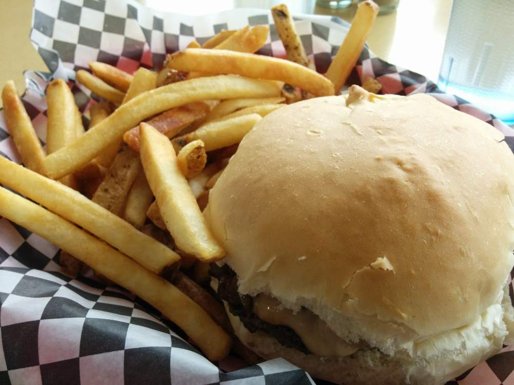 After a bit of determination, we ordered the Salisbury burger ($6.50), with mushroom sauce and mushrooms over the patty, along with a side of fries ($5); and the regular burger ($4.50) with a side of deep-fried mushrooms ($5). Here’s the menu, taken at the time of our visit.