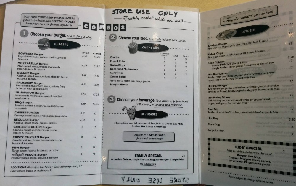 Today, on a day full of rain, Jack suggested we go out to a surprise location for lunch. I’m always down for surprises. By the time we drove into Bowness, I was hopping. “Angel’s?!” I guessed/demanded. Indeed it was. Angel’s Drive In.